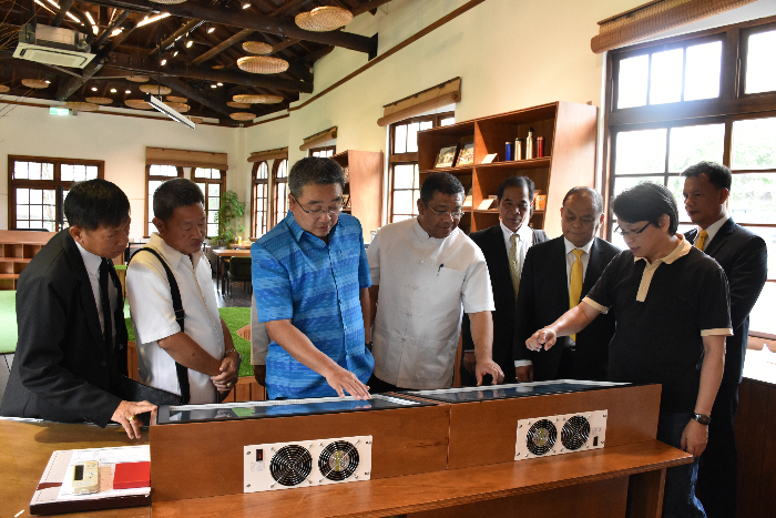泰國經貿辦事處通才大使(左3)與貴賓們參訪校友服務中心、體驗使用數位校史系統