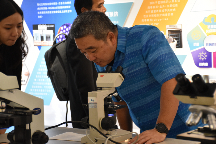 生物技術與動物科學系鄭永祥主任(右1)導覽生技生動展示室