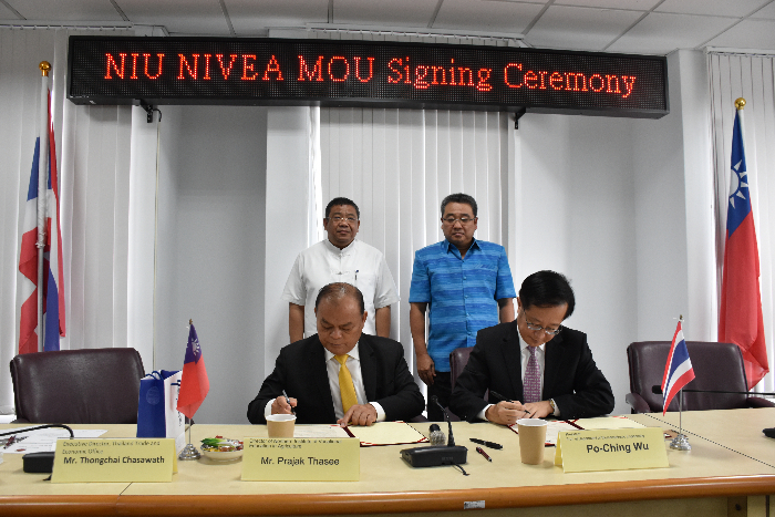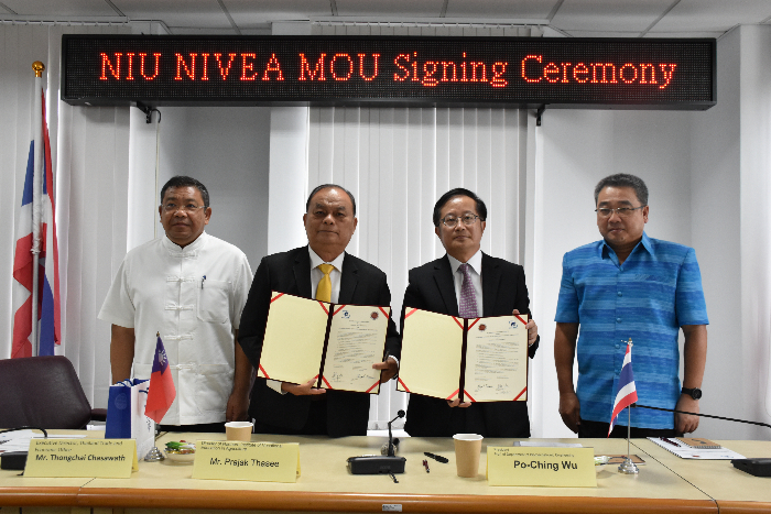 本月10日於泰國貿易經濟辦事處通才大使(Mr. Thongchai Chasawath)、達府(Tak Province)府尹Mr. Charoenrit Sanguansat之見證下,國立宜蘭大學與Northern Institute of Vocational Education in Agriculture(NIVEA)簽署合作備忘錄。與會者包括本校國際長程安邦教授和國際處團隊、生物資源學院陳威戎院長、生資院碩士在職專班陳怡伶主任、生物技術與動物科學系鄭永祥主任、生物機電工程學系楊江益主任、食品科學系陳淑德主任、森林暨自然資源學系蔡呈奇主任和本校農業推廣委員會陳永松教授。