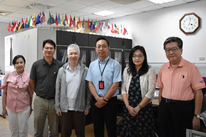 UWE教務長陳祖豐博士(右三)與本校國際長游依琳教授(右二)、人管院林豐政院長(左三)、外文系賴軍維主任(左二)、國際學生組高珮文組長(左一)於國際處合影