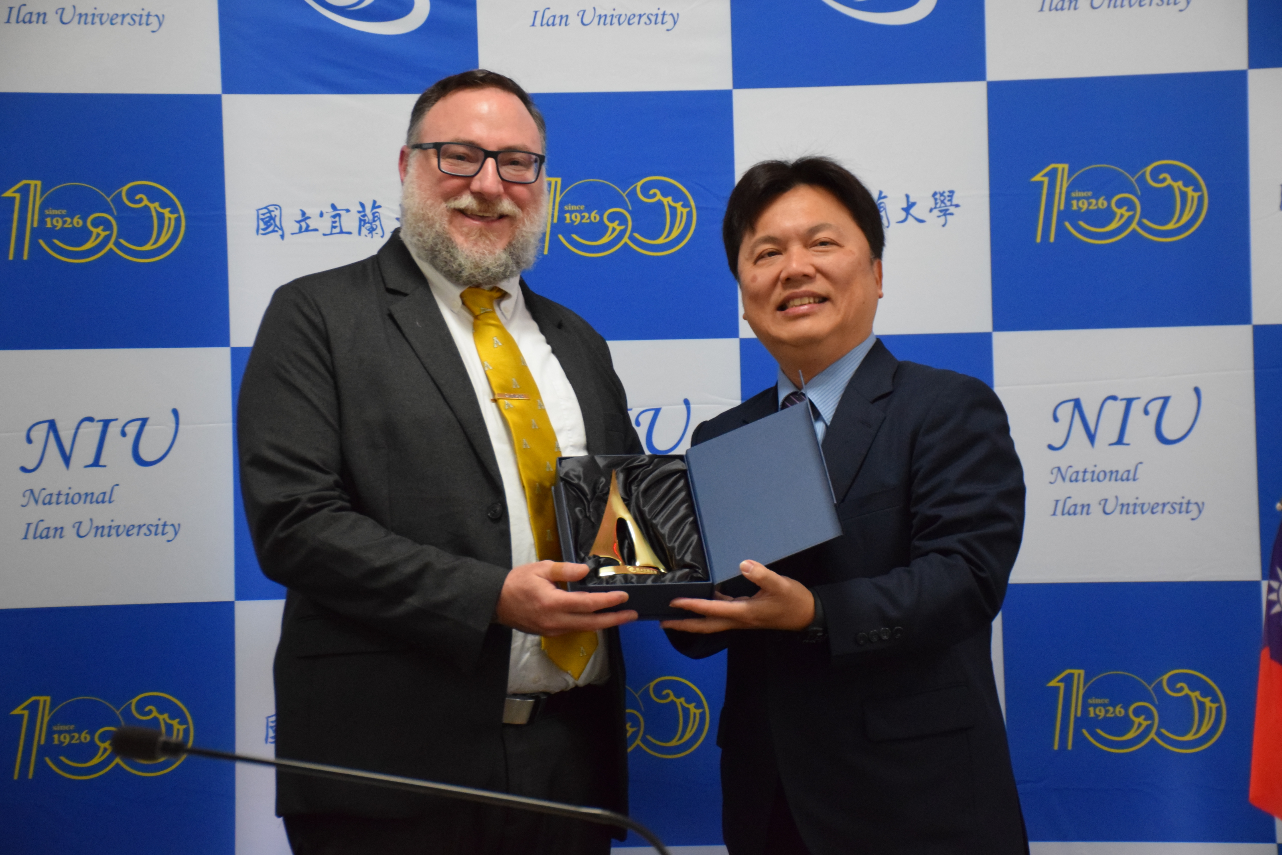 本校陳威戎校長致贈紀念品予美國阿巴拉契亞州立大學助理副校長暨國際事務主管Jeff Cohen博士